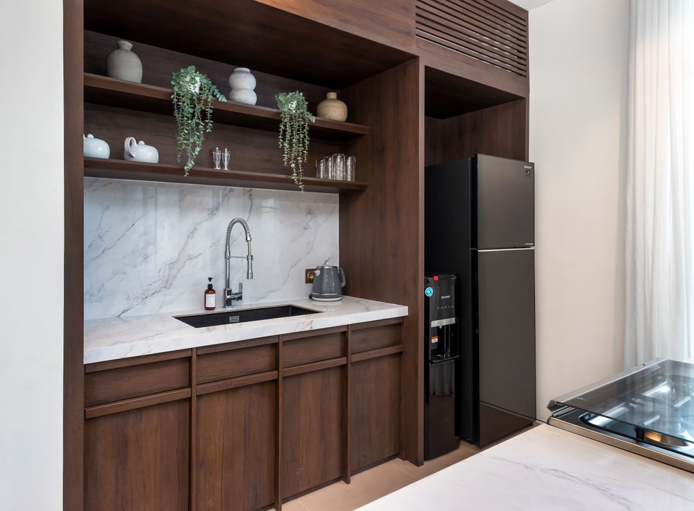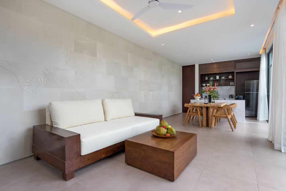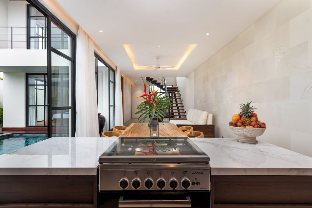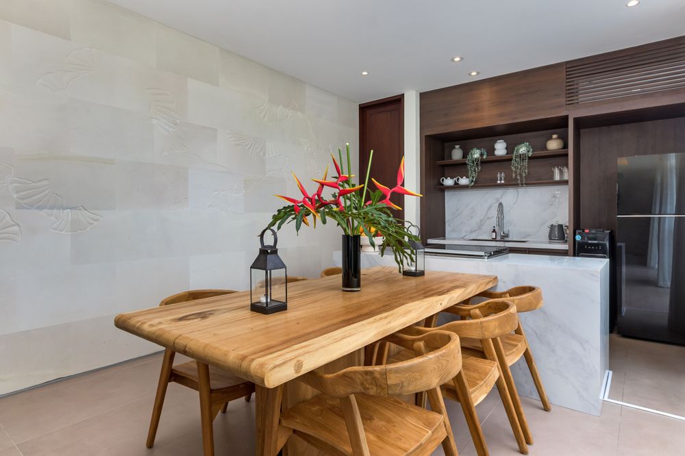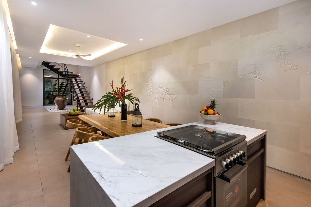 As implied by its name, Blanc Haven features an interior design prominently influenced by white palimanan stone, with the accent wall stretching from the living to dining area. This intricate carving captures the graceful fluidity and rhythmic elegance of traditional Balinese dance, translating the dancer’s ethereal movements into a tangible, artistic form.