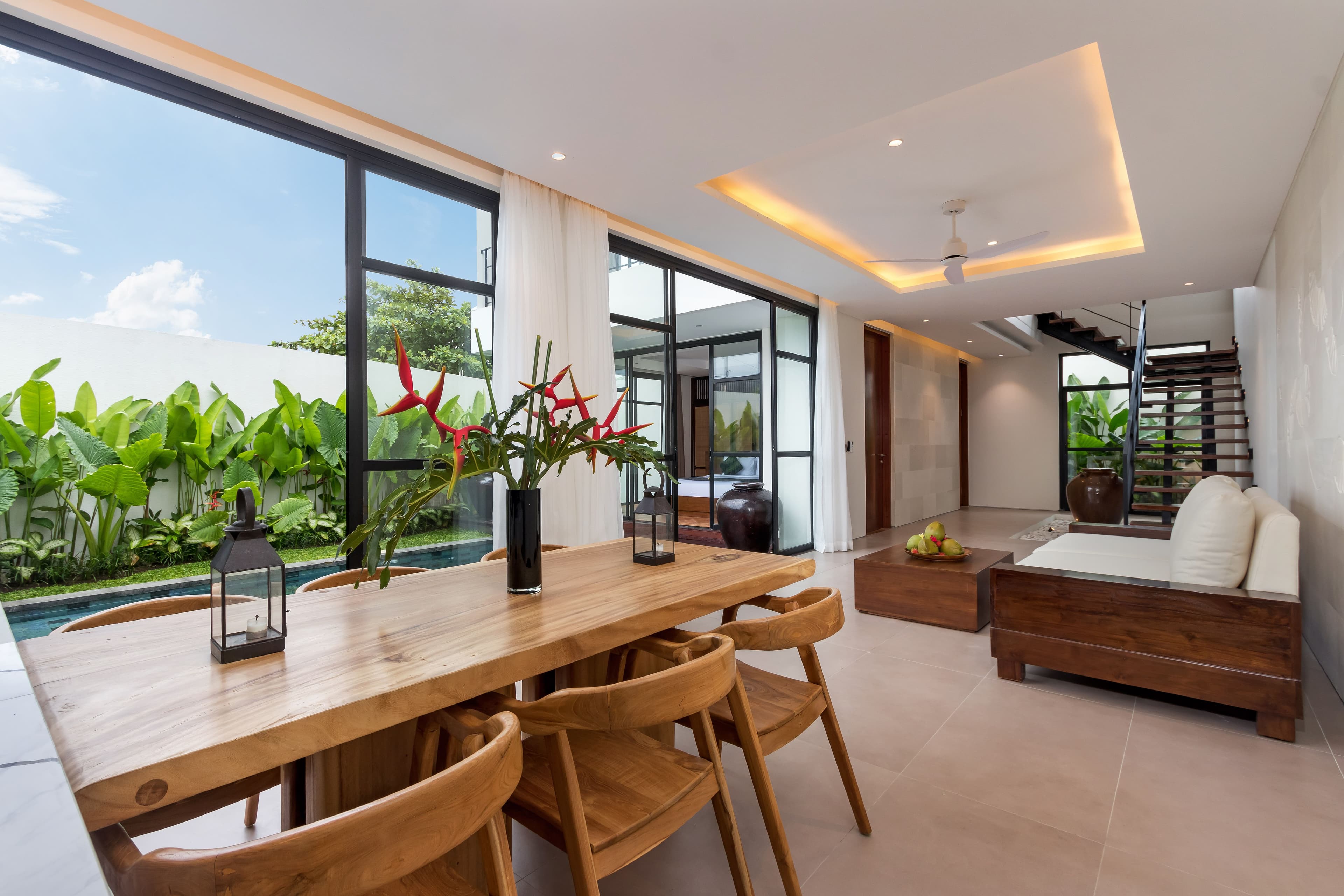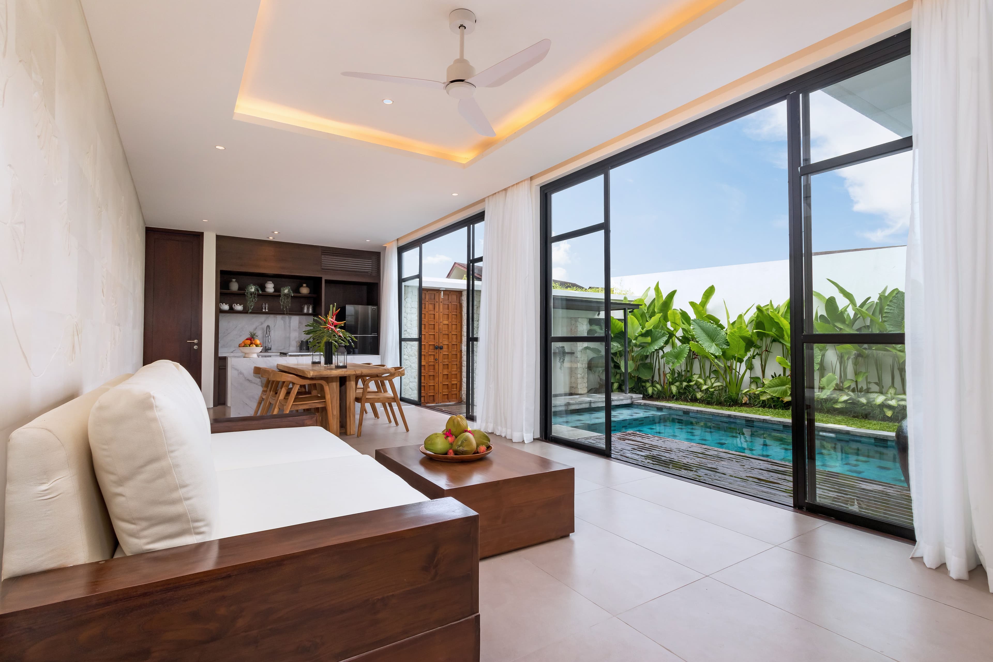 Blanc Haven is defined by its white palimanan stone design. An intricately carved accent wall inspired by the fluid elegance of traditional Balinese dance creates a serene, airy atmosphere rooted in natural materials. The villa features seamless indoor–outdoor living with an open-plan layout that can be enclosed for flexibility. Spacious yet intimate, it is ideal for gatherings, relaxation, and shared moments.