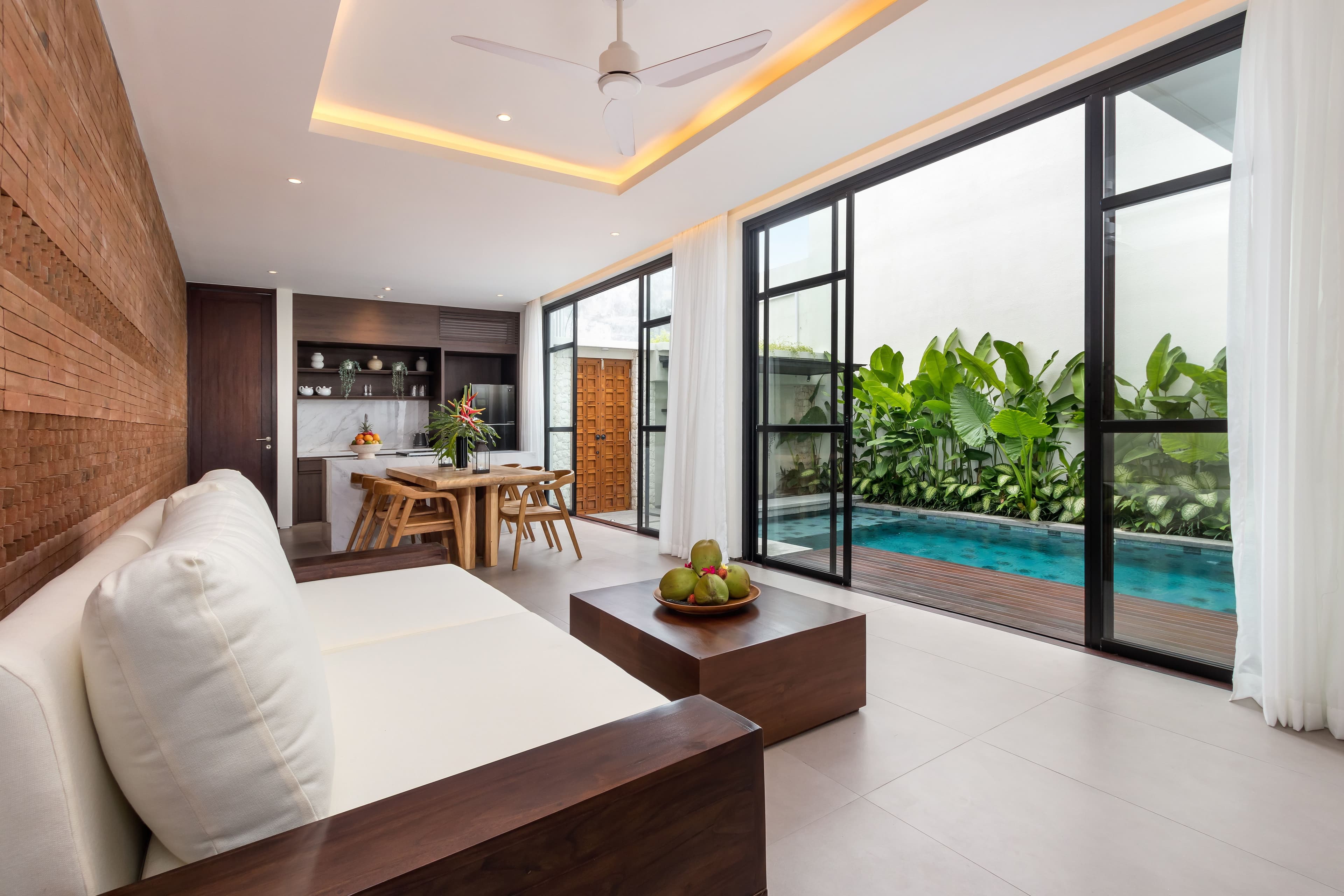 Sienna Haven is defined by its Balinese brick–inspired design. Earthy tones and textured surfaces create a warm, authentic atmosphere that reflects Bali’s character. The villa features seamless indoor–outdoor living with an open-plan layout that can be enclosed for flexibility. Spacious yet intimate, it’s ideal for gatherings with friends and family or quiet relaxation.